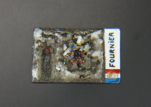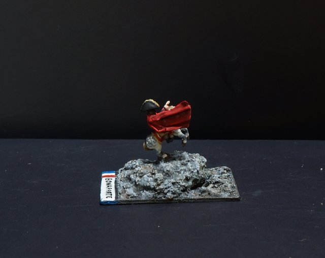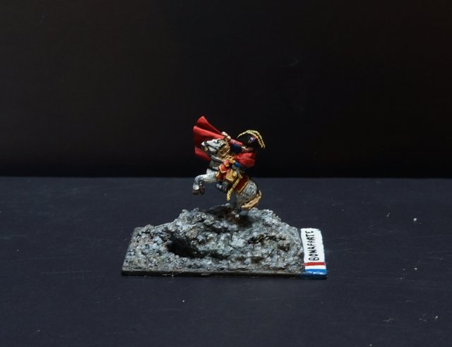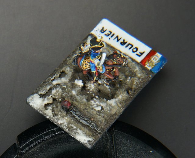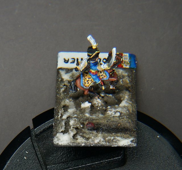 Le hussard est prêt pour les finitions : peinture du socle et vernissage mat (vernis en bombe Pébéo).